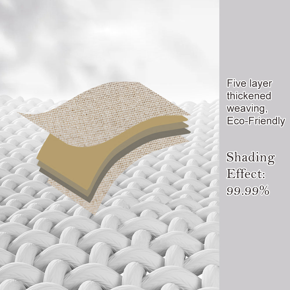 Fabric with the same solid color on both sides. Super soft and super thick. Perfect for your bedroom where you deserve a fully dark sleeping atmosphere and privacy protection. It can block up to 98% of the sunlight and the UV. The darker color works better in blocking the light.