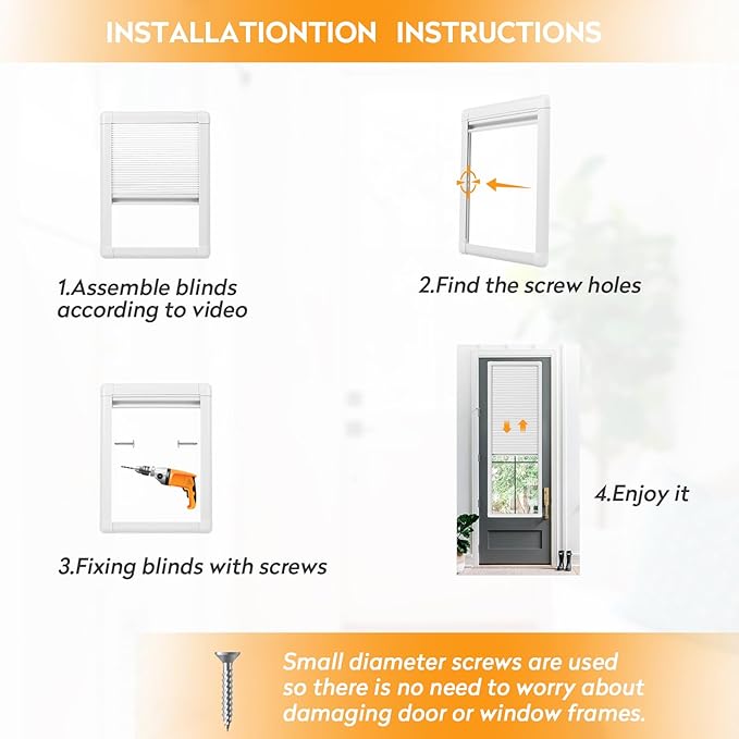 The English instruction manual that comes with the product contains text and video instructions, while there are very few steps to assemble and install the blinds for windows doors.