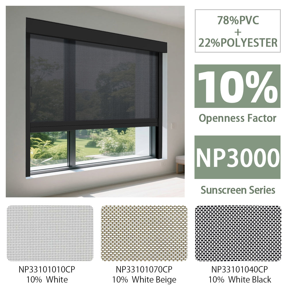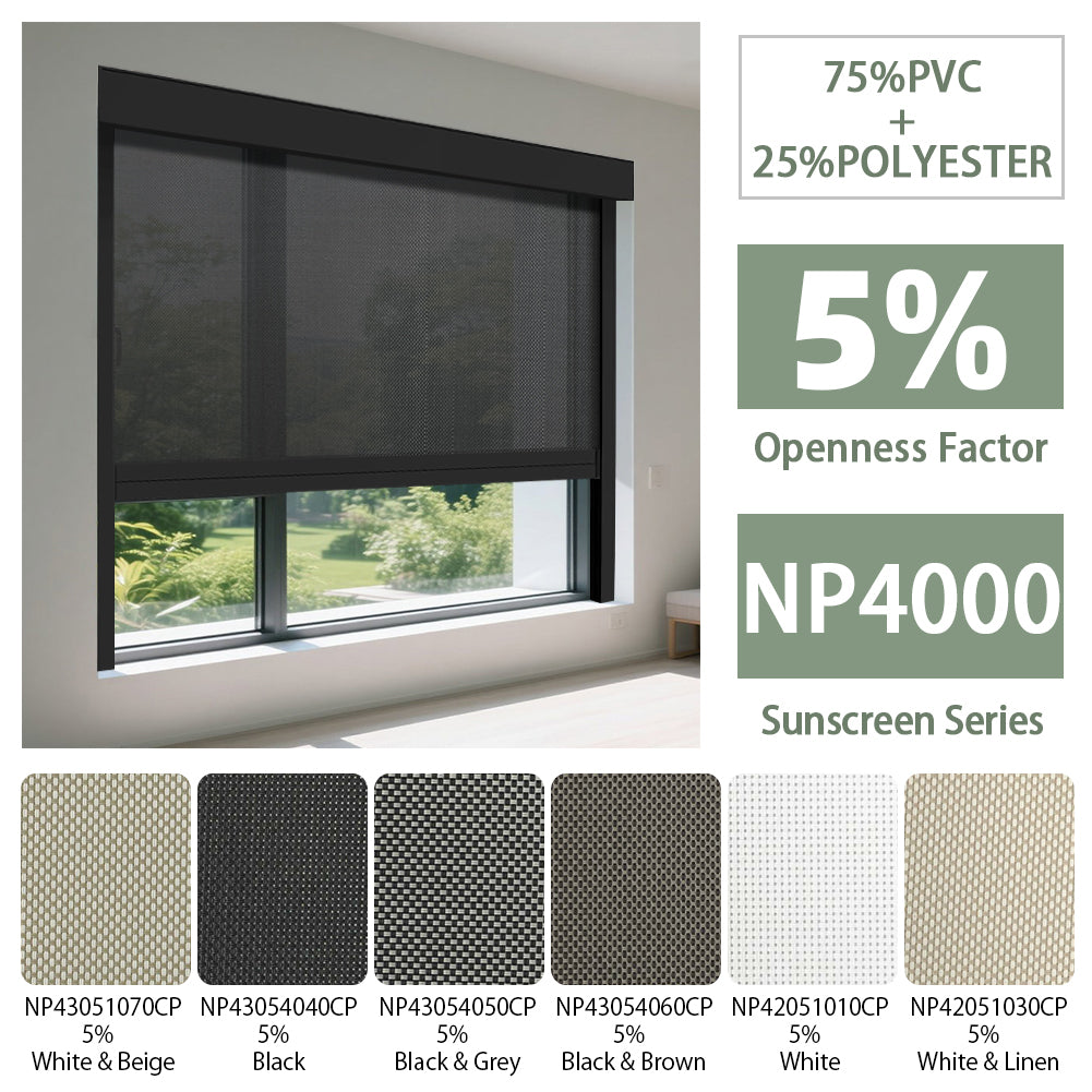 Polyester and 70% PVC. Light filtering sunshine fabric and 10% openness. Water-proof and fireproof fabric. Suitable for outdoor balcony patio porch and so on.