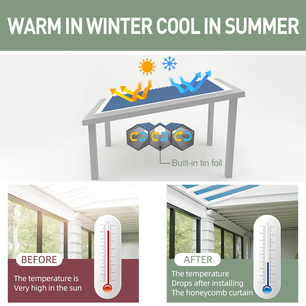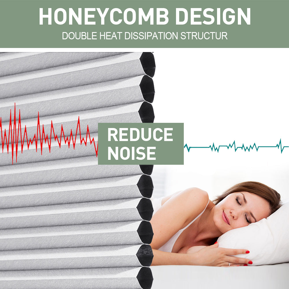 Blackout material, cellular blind is made of 0.55" single cell blackout honeycomb fabrics with aluminum foil, which can 100% block sunlight. All honeycomb fabrics have a white backing to reflect even more daylight and provides a uniform appearance from the outside. Both sides can be installed.