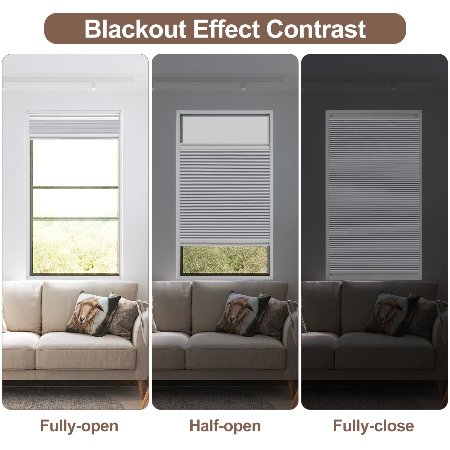 Cellular blind is made of 0.55" single cell blackout honeycomb fabrics with aluminum foil, which can 100% block sunlight. All honeycomb fabrics have a white backing to reflect even more daylight and provides a uniform appearance from the outside.