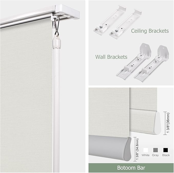 Panel track blinds are designed specifically for DIY and easy installation. Each set comes with a complete hardware kit, including all the necessary mounting parts. You can choose different installation methods (wall or ceiling) according to your needs. (1) Inside Mount: Minimum 2.5-inch depth needed; (2) Outside Mount: Minimum 2.25-inches of bracket height required on the top.