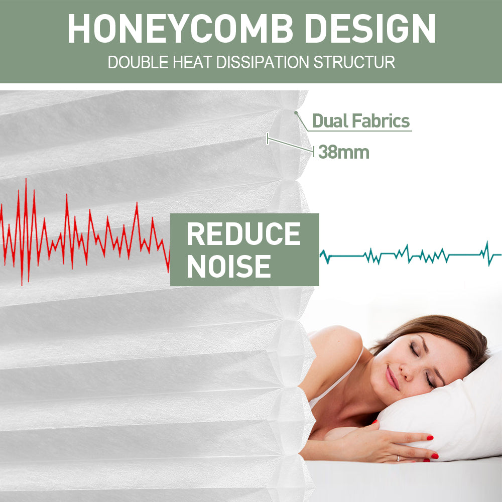 Cellular blind is made of 0.55" single cell blackout honeycomb fabrics with aluminum foil, which can 100% block sunlight. All honeycomb fabrics have a white backing to reflect even more daylight and provides a uniform appearance from the outside.